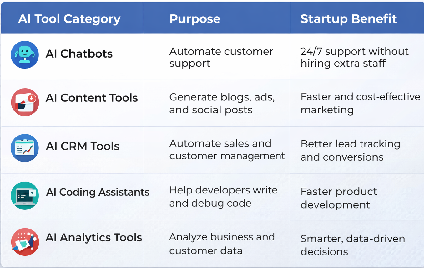 AI tools enable startups to automate repetitive tasks, make smarter decisions using data, and improve productivity across teams. Instead of spending hours on manual work, founders and employees can focus on innovation, customer experience, and strategic expansion. This results in faster scaling with fewer resources.